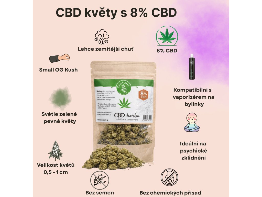 Malé, ale pevné a voňavé CBD květy s 8% CBD v balení 5 g. Ručně pěstované, bez semen, s příjemnou zemitější vůní a přirozeně relaxačním charakterem.