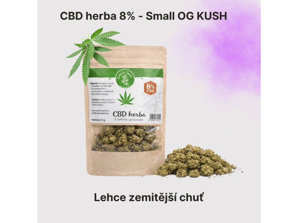 CBD květy s 8% obsahem CBD z certifikované odrůdy technického konopí Small OG Kush. Jedná se o menší, ale pevné a kvalitní květy bez semen, vhodné k dalšímu zpracování. Díky pečlivému pěstování a zpracování vynikají příjemnou zemitější chutí a vůní.