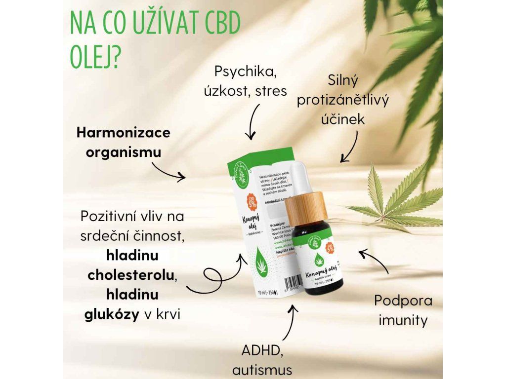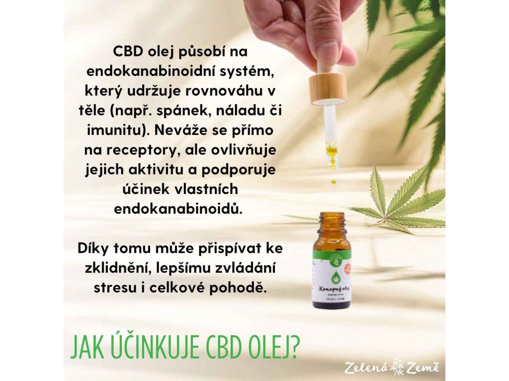 CBD (kanabidiol) je jedním z kanabinoidů obsaženým v konopí. CBD působí především na CB1 receptory (ty v mozku) a to tak, že je chrání před aktivací. Konopné kapky s CBD harmonizují přirozené procesy v těle a tím podporuje jeho obranyschopnost. Mají pozitivní vliv na srdeční činnost, hladinu cholesterolu, hladinu glukózy v krvi, normální stav kůže a funkci svalů a kloubů. Pravdou je, že olej působí blahodárně na celou škálu neduhů, ale nemůžeme je zde uvést. Nezbývá, než ho vyzkoušet a přidat tak vlastní zkušenost. Více o účincích konopého oleje.