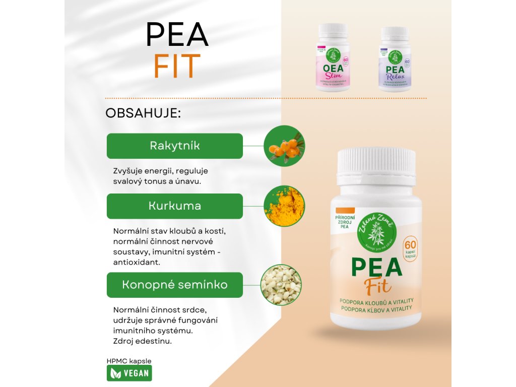 PEA FIT jsou přírodní kapsle pro podporu regenerace a vitality. Pomáhají tělu lépe se zotavit při únavě, zvýšené zátěži nebo po nemoci či úrazu. Vhodné pro aktivní lidi i pro období rekonvalescence.