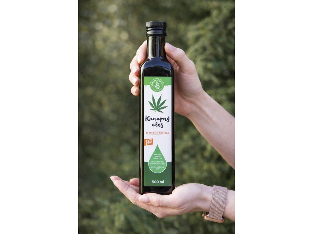 BIO Konopný olej - bohatý zdroj omega nenasycených mastných kyselin 3,6 a 9. Obsahuje také vitamíny A, B1, B2, B6, C a E (ve formě tokoferolů), fytin (používaný v lékařství při léčbě chudokrevnosti), chlorofyl a lecitin. Prémiová kvalita a příjemná oříšková chuť. Vzniká zastudena lisováním konopných semínek. Vhodný do kuchyně i na pokožku. Vyrobeno v České republice.